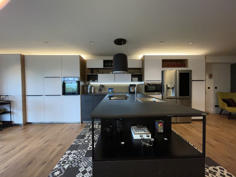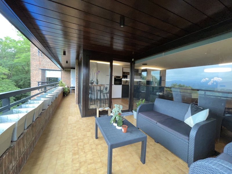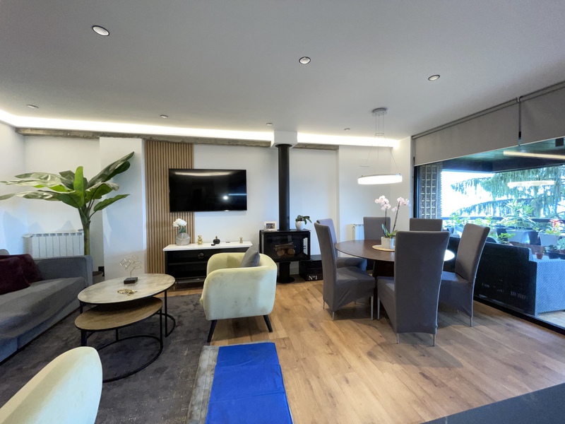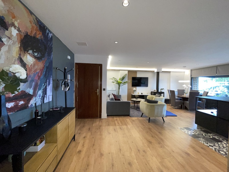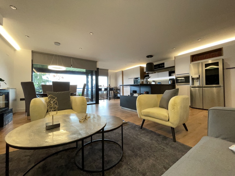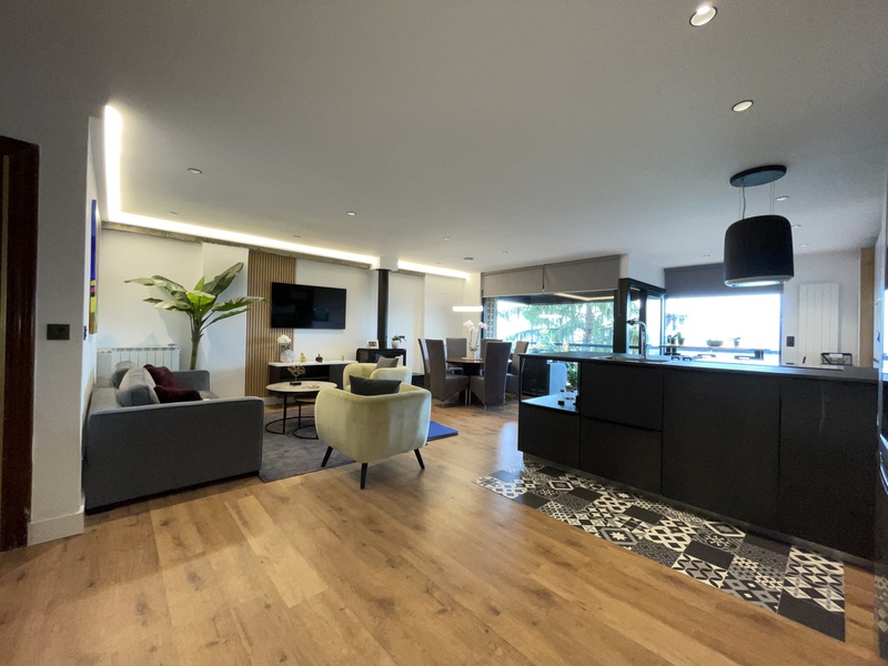 Nada mas entrar en la vivienda nos encontramos con un imponente salón con ventanales y vistas a zonas verdes y montes. Este salón se comunica con cocina la cual dispone de gran isla, electrodomésticos de alta gama, frigorífico doble americano, todo con salida a la gran terraza.