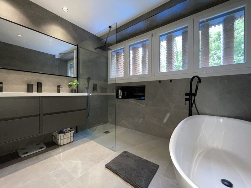 para el ACS y la calefacción, baños con doble lavabo, ducha extragrande con ventanales exteriores y bañera de diseño, impresionante isla en la cocina, etc